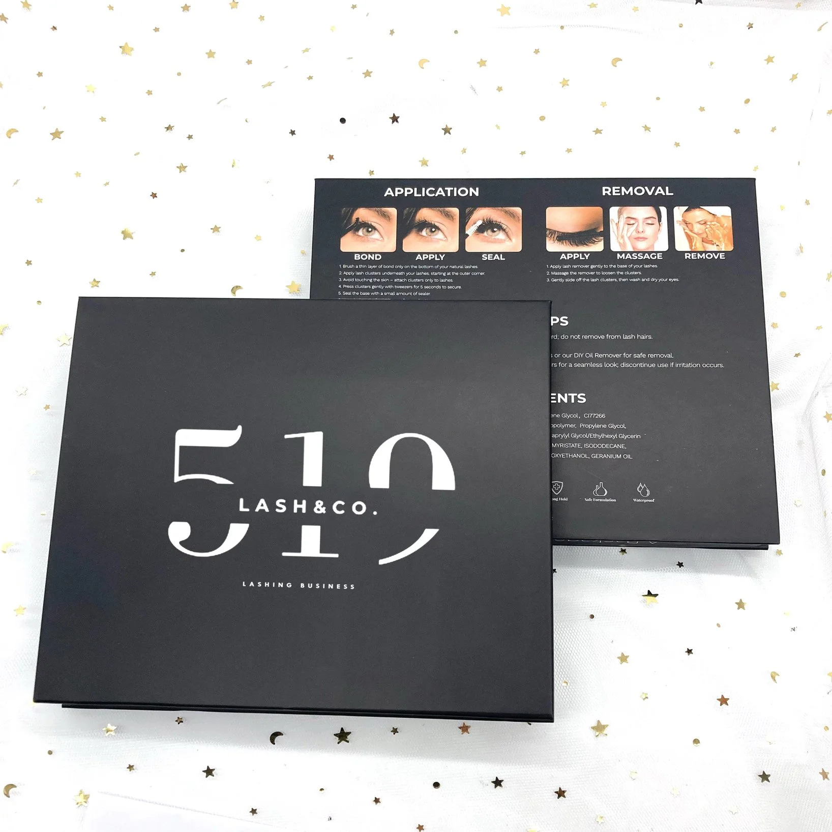 Our signature lash kit contains tweezers, glue, sealant, remover, our famous lash clusters (10-18 with spikes and bottoms) and a m